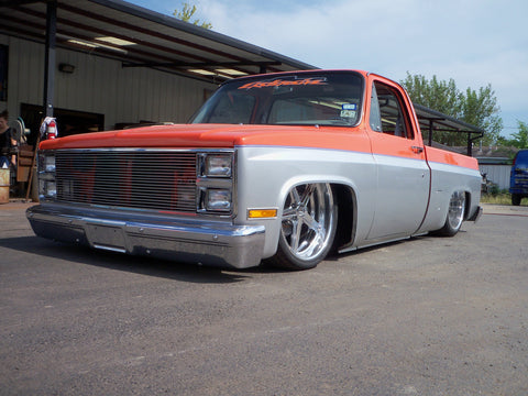 1973-87 Chevy C10 Full air suspension setup. This will lay your truck on the ground with up to 20in wheels with no modifications. This kit requires 3" drop spindles. ( Not Included )